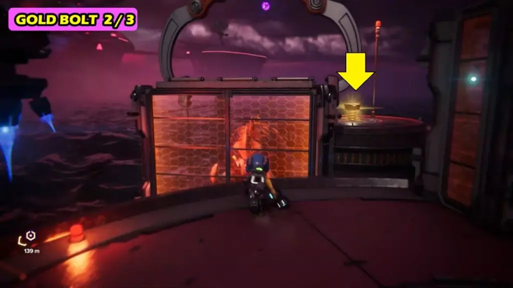 The 2nd Gold Bolt can be collected during the objective “free Ratchet and Kit”. Just after freeing Clank and the others, you move ahead to the outside area (to the north). This area will be crawling with enemies. The Gold Bolt is on a circular platform on the northeast corner of this area. To reach this circular platform you first need to jump on the hanging cubicle from where you can easily reach the gold bolt.