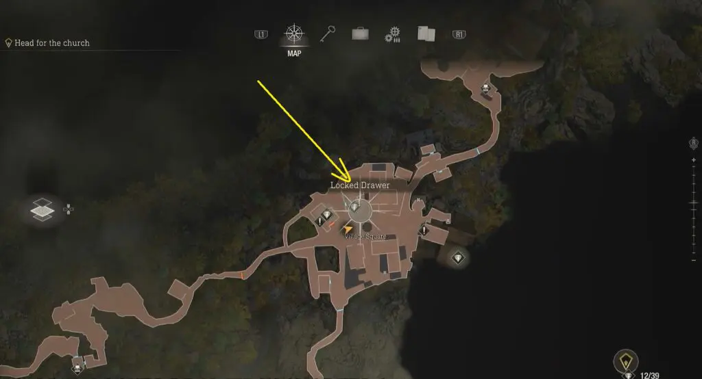 The locked drawer at the village square is available in chapter 3. Head inside the building on the left side and use the small key to open the drawer. The location is marked on the map below.