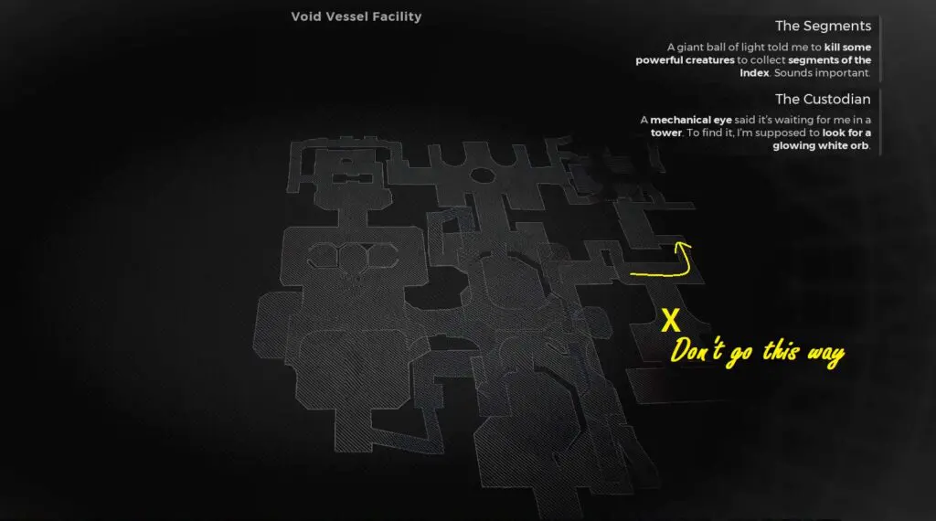 From the checkpoint of the Void Vessel Facility, proceed into the first chamber. Within this room, you’ll notice that most paths are blocked. Head to the right and go up the ramp to the top.