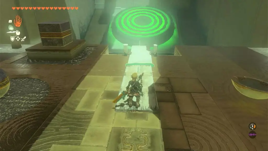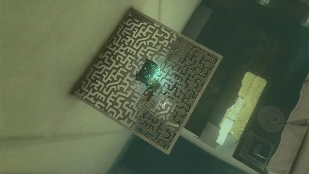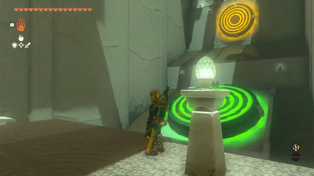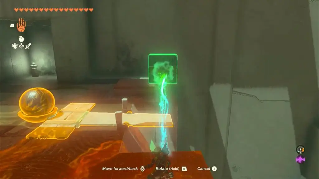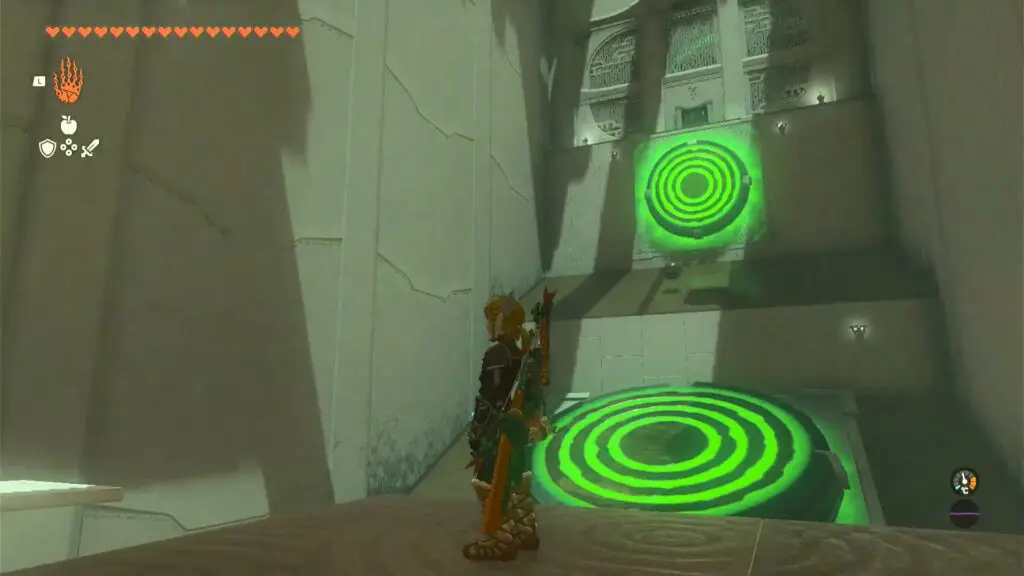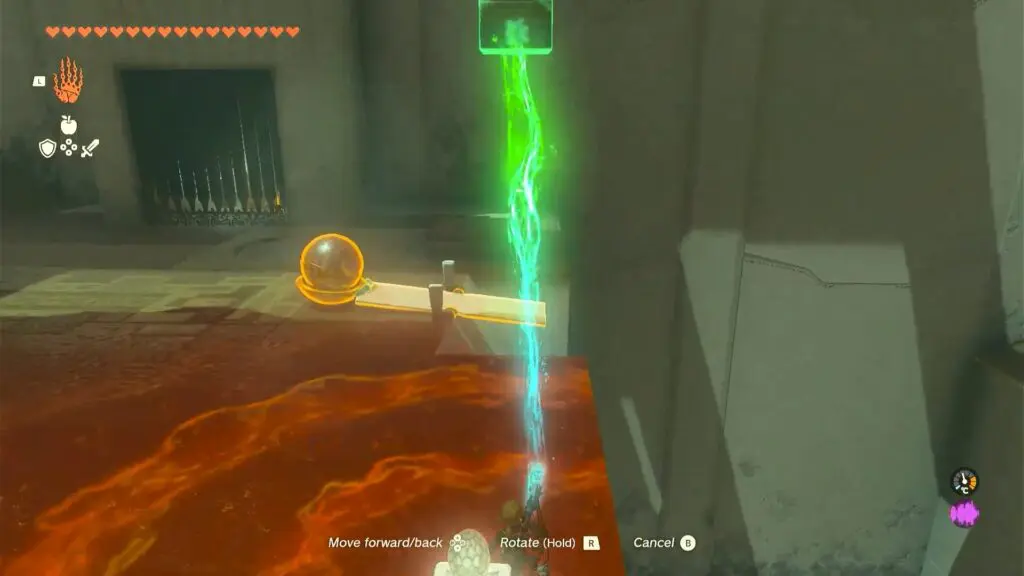 As you enter the shrine, you will find a bowl, a box, a slab, and a ball. Use ultrahand on the half bowl and attach it to the slab/board hanging off the edge to make a catapult. Then Place the ball in the bowl. Hold the box and elevate it to a higher position on the opposite side of the catapult. Let go of the box, resulting in a forceful launch that propels the ball toward the target. Refer to the below image