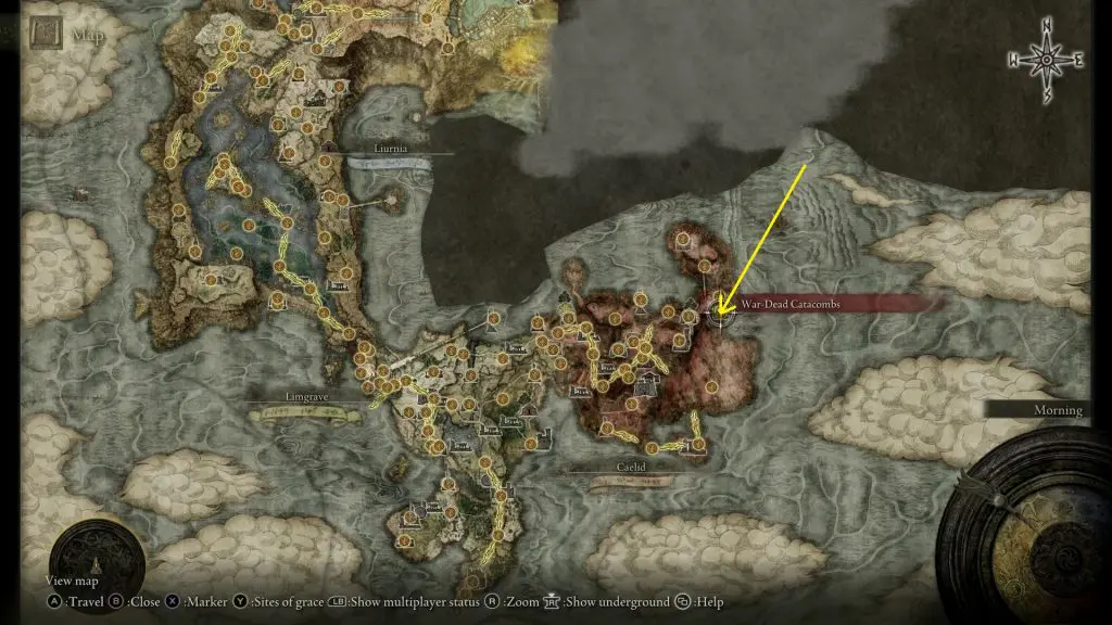 This guide shows the complete walkthrough of the War Dead Catacombs in Elden Ring. War Dead Catacombs is in Caelid at the location shown in the picture below.
