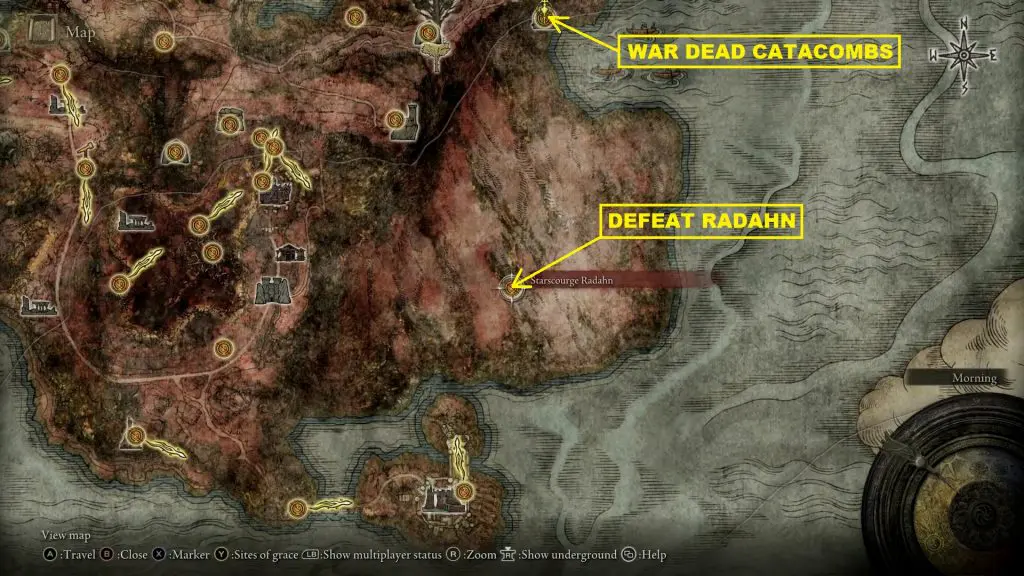 To reach the catacomb, you will have to first defeat General Radahn. Challenge and defeat General Radahan in Redmane Castle, which is in the southeast portion of Caelid. After Radahn Boss Fight, go north to reach the War Dead catacombs.