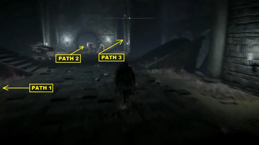 After entering the catacomb, go down the stairs and you will reach a hall. In this hall, you will see three paths ahead of you as shown below.