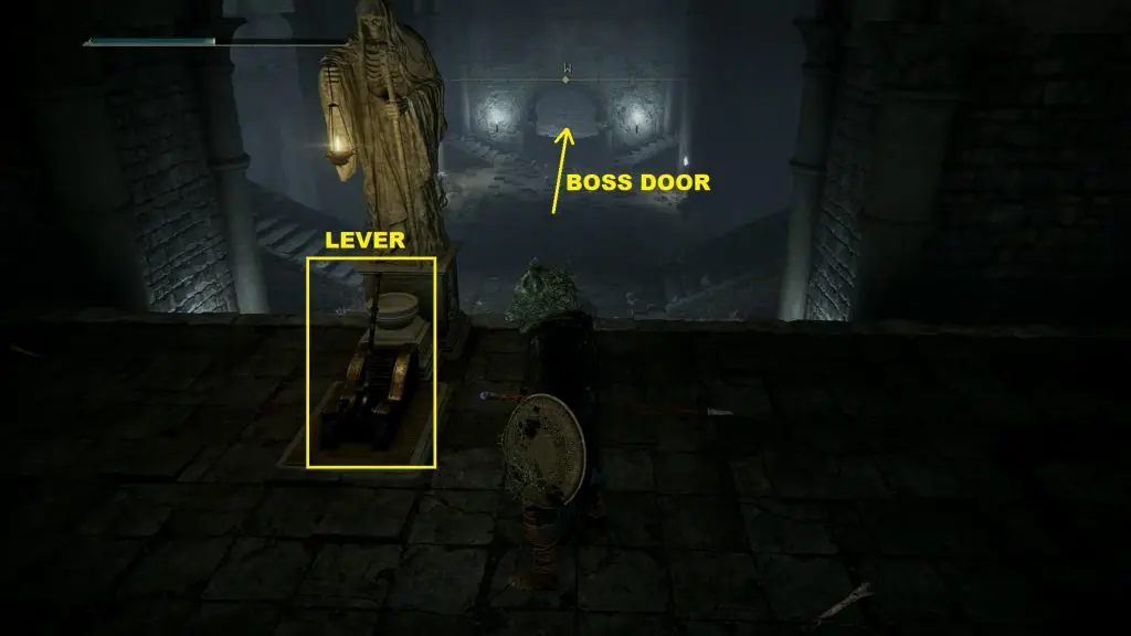 After jumping down the window, you will find a lever in front of a statue. Pull the lever to open the boss door. Then jump down and go through the path on the west side as shown below to reach the boss lair. Defeat Putrid Tree Spirit boss to get Redmane Knight Ogha ash and a Golden Seed.