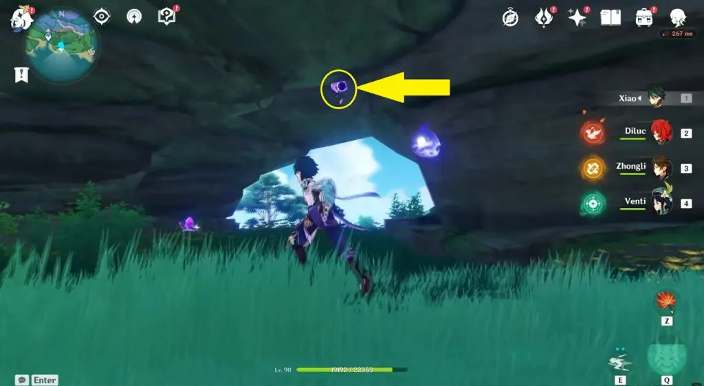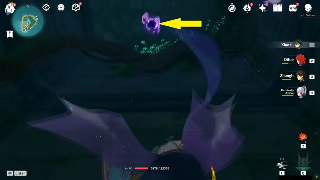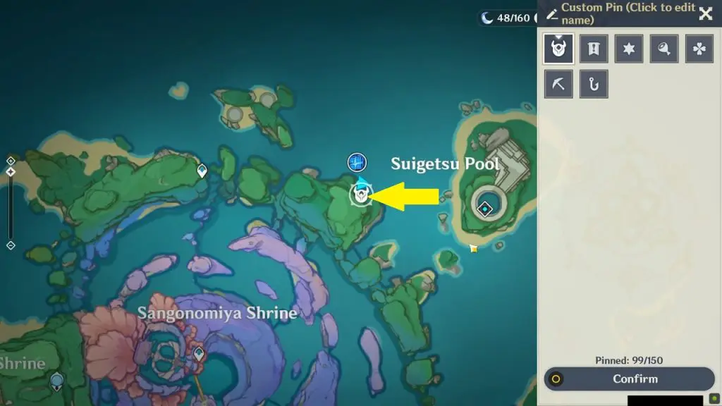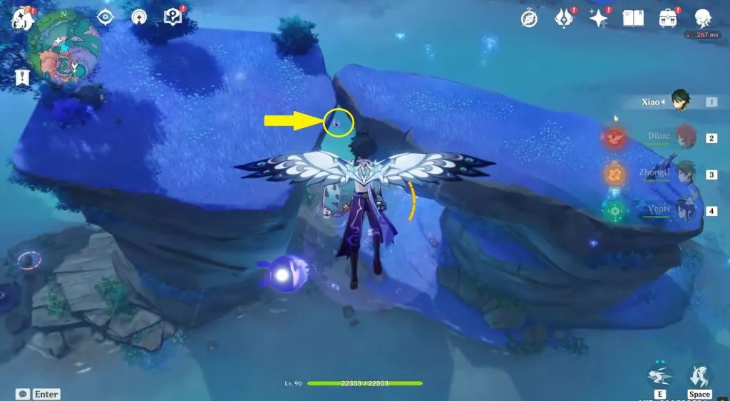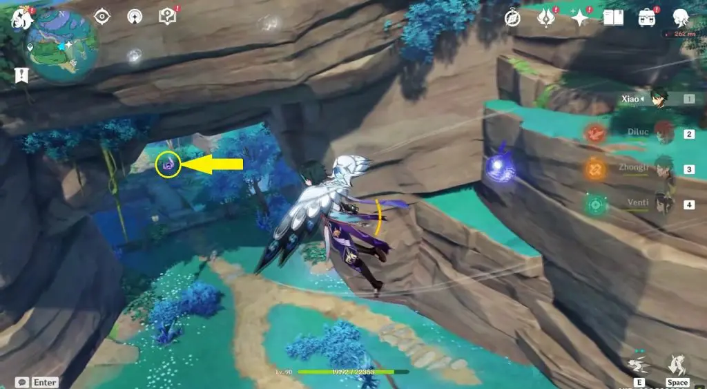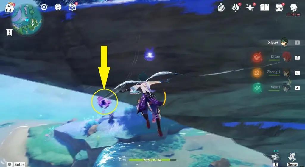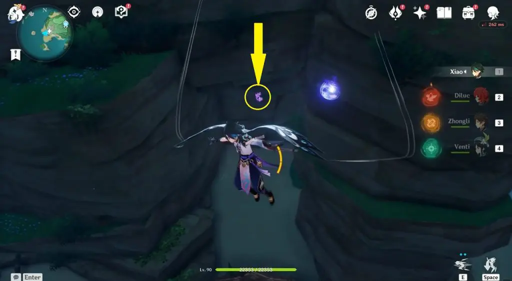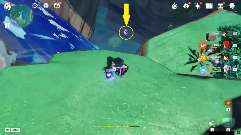 This electroculus is inside a cave at the highlighted location east of Sangonomiya Shrine. You will reach there during the ‘Heart of Watatsumi’ world Quest. After entering the cave, look up and you will see the electroculus up in the air. Climb the wall to reach it.