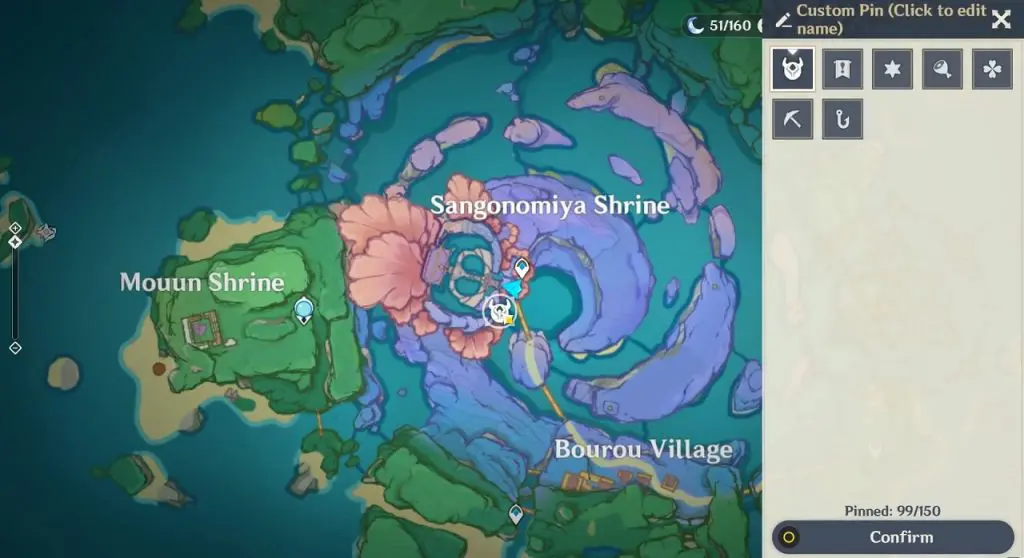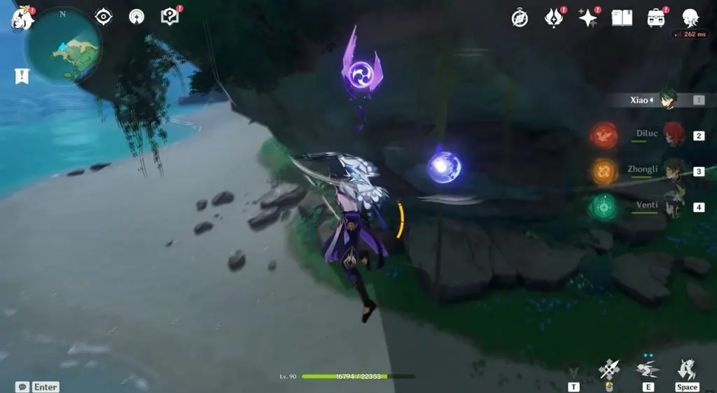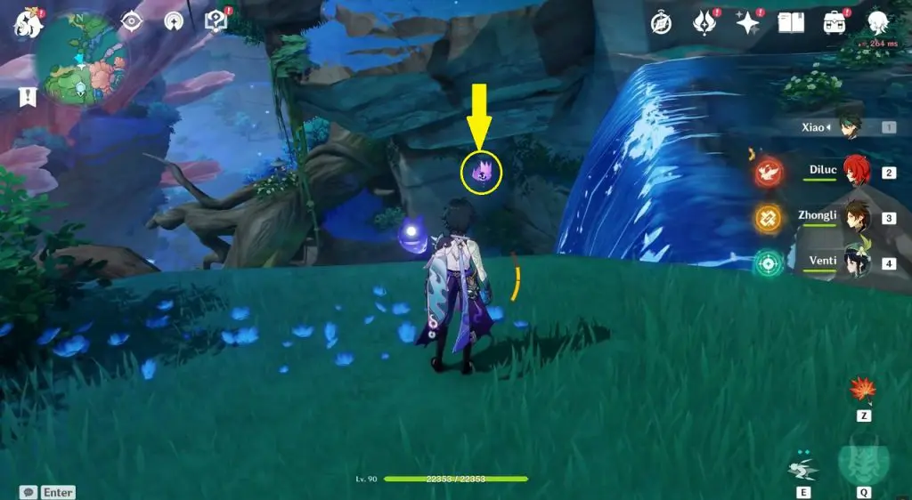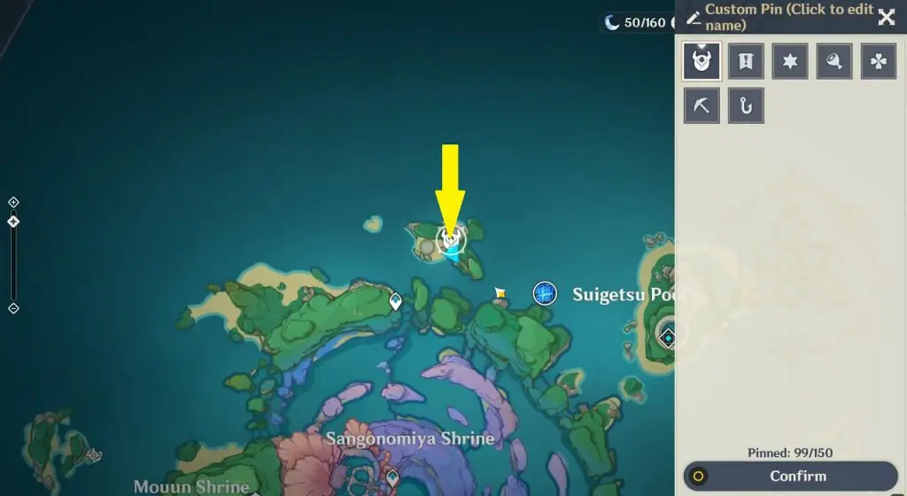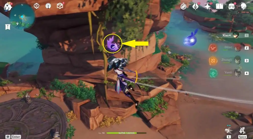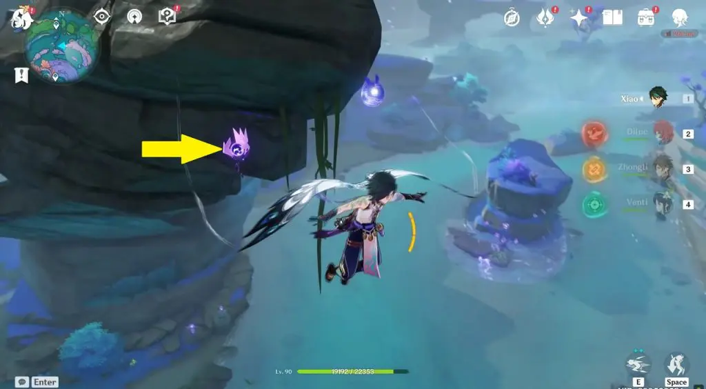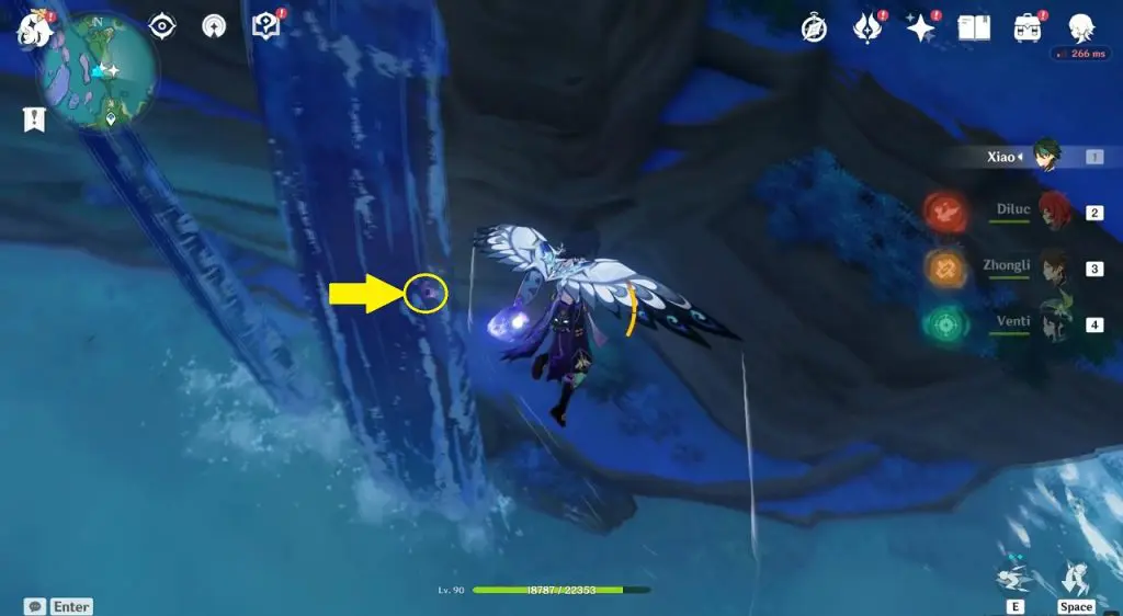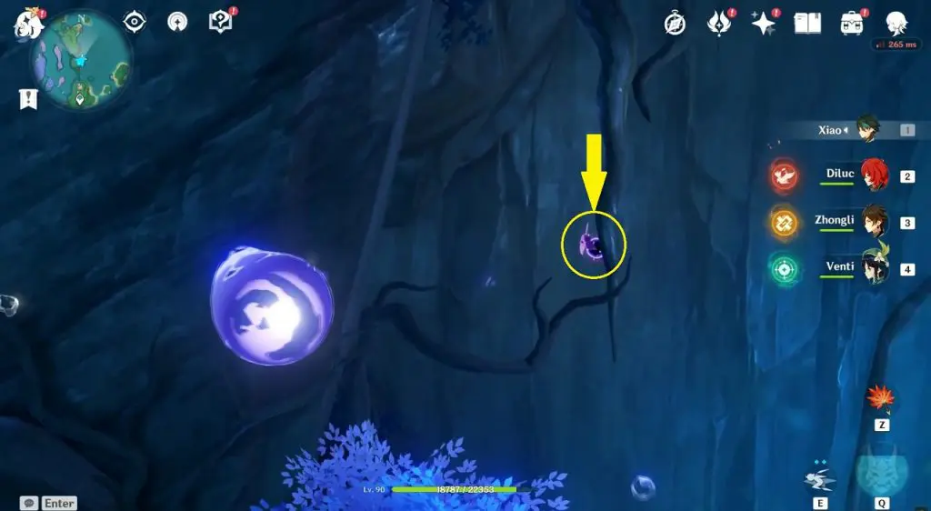 This electroculus is inside a cave at the highlighted location east of Sangonomiya Shrine. You will reach there during the ‘Heart of Watatsumi’ world Quest. After entering the cave, look up and you will see the electroculus up in the air. Climb the wall to reach it.