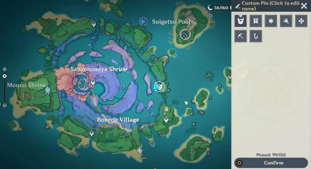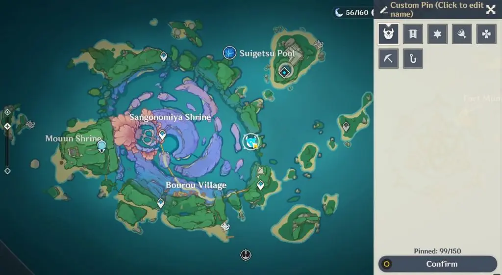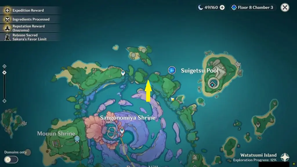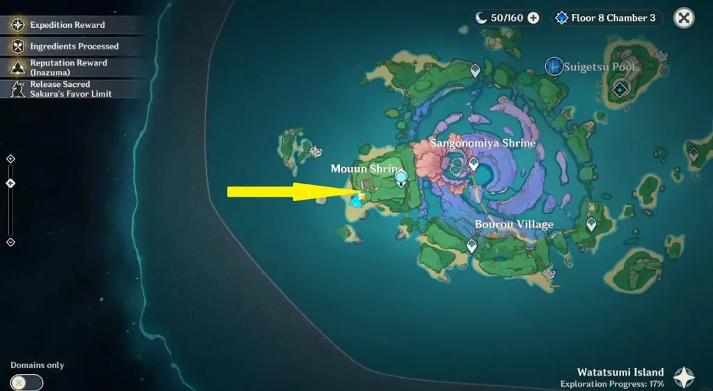 There is an electroculus near the ‘Palace in a Pool‘ domain in Suigetsu Pool. Suigetsu Pool is on the northeast side of Watatsumi island as shown in the picture below. To get the electroculus chest you will first need to drain out water from the pool. Click here to see how to drain out water from the pool.