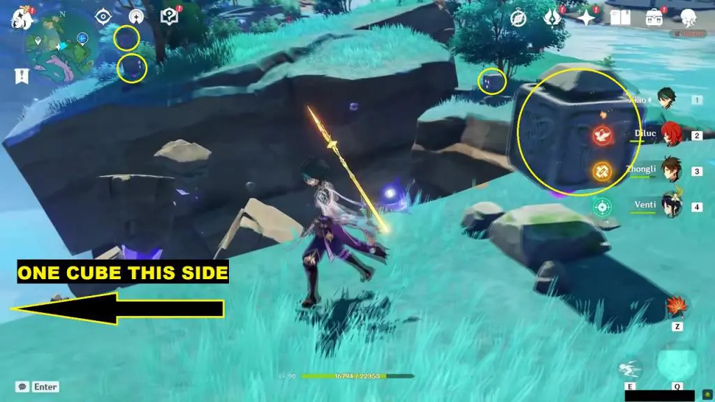 This location has five rotating cubes as shown below. Hit each cube until they face south. Doing this will activate an Electrigranum Plant on the east side of the waterfall.