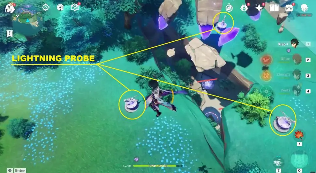 The electroculus is high up in the air at the highlighted location south of Bourou Village. Here you will find three Lightning Strike Probes. Summon Electrogranum from the plant nearby to get charged. Then activate the three probes by standing at the front of the protruding edge of the probes. When the three probes are activated, two thunder spheres will appear in the area. Use the thunder spheres to jump on the broken platform underneath the electroculus. The broken platform will join when you have Electrogranum with you. Then jump above using the thunder sphere to get the Electroculus.