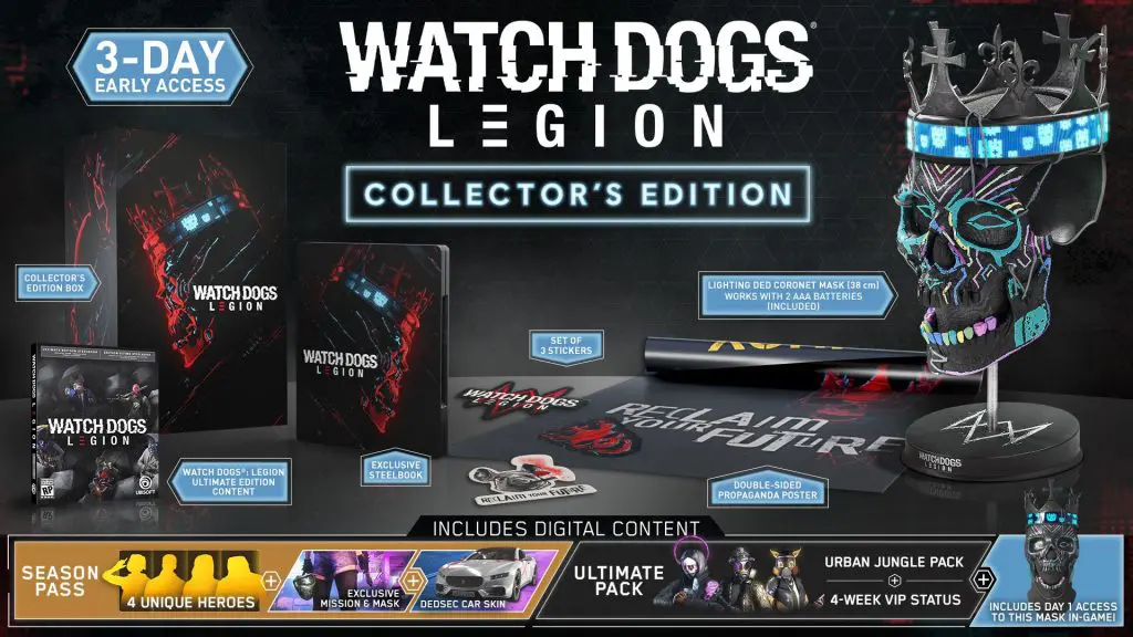 Collector’s edition (189.99$ in Ubisoft Store): Ultimate Edition Content, Collector’s Edition Box, exclusive Steelbox, Set of 3 Stickers, Double Sided Propaganda poster, Lighting Ded Coronet mask
