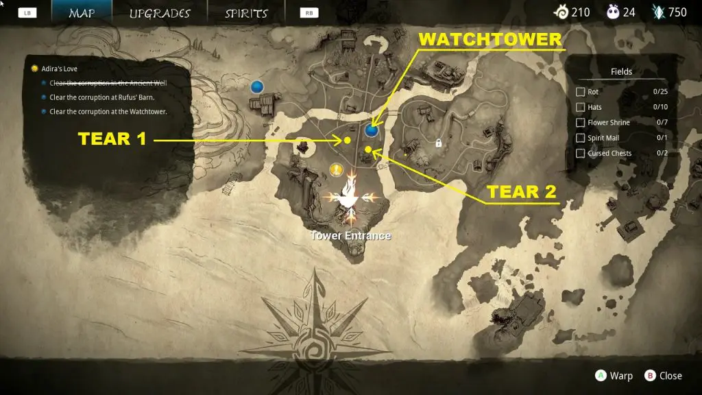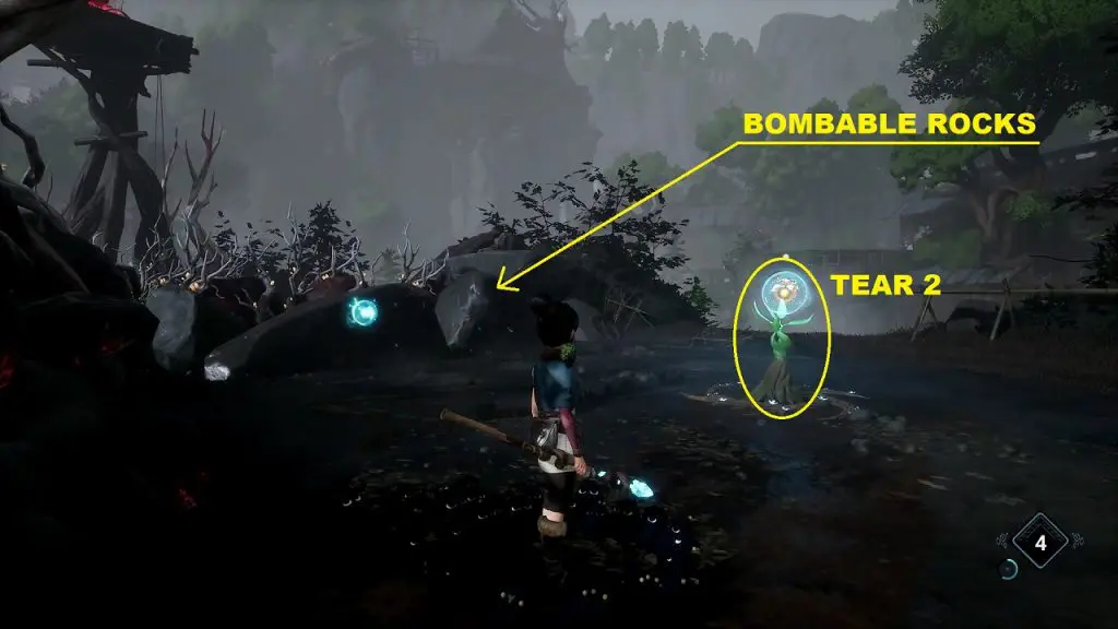 Between the Tear 2 and the watchtower, there will be bombable rocks. Bomb the rocks to move them. Then summon the tear from the plant and use it to destroy the corruption blocking the path leading to the tower. After destroying the corruption go near the watchtower.