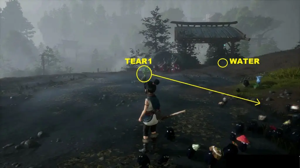 You will find a water bucket in front of the wooden arch near the tear as shown below. Use rot to water the tear. This will make it grow into a plant. Summon the tear and use it to destroy the corruptions blocking your path leading to Tear 2 (See the picture above for location).
