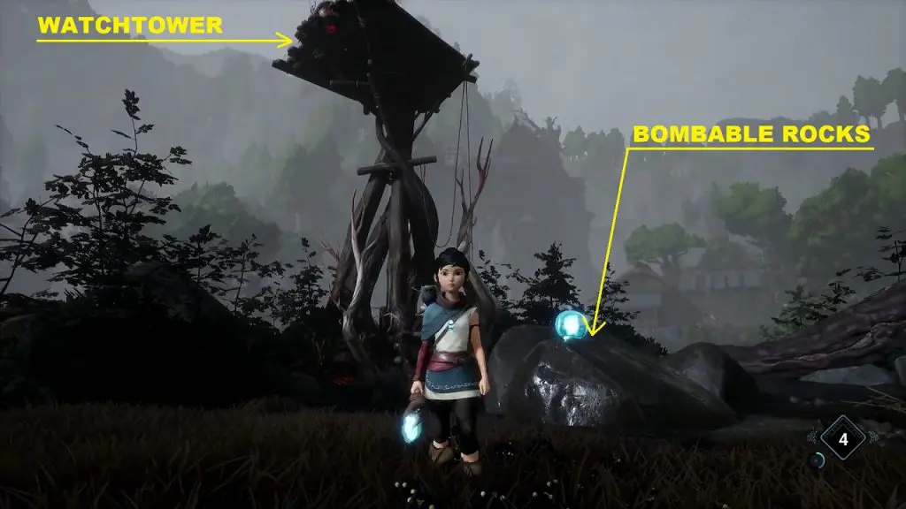 In front of the watchtower, you will find another set of bombable rocks as shown below. Throw a bomb on the rocks to make them levitate and form floating platforms.