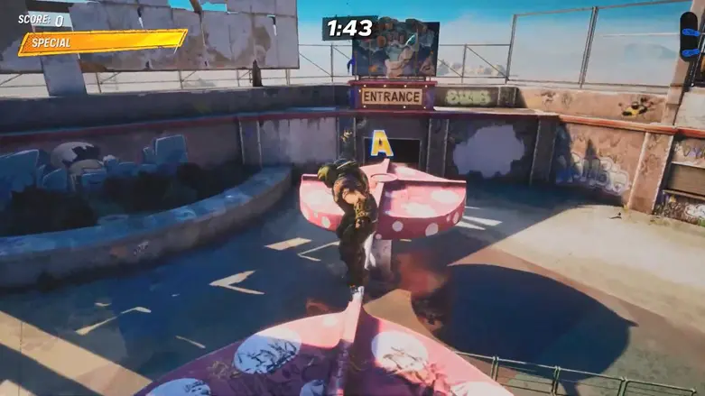 After you get the letter A, go through the door to enter the Bowl Slide. At the top of the slide, grind along the edge to collect the letter T.
