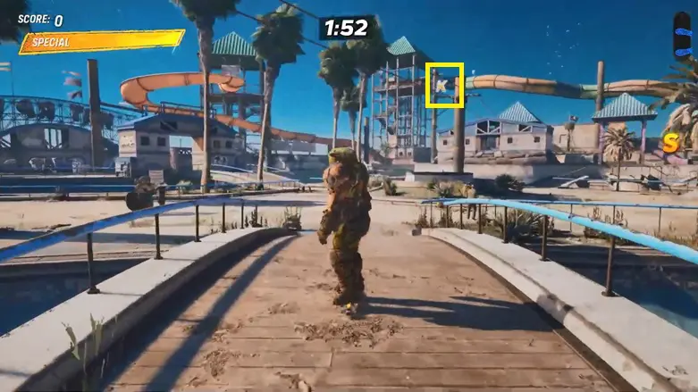 Keep going straight, and after you cross the second bridge, you’ll find the letter K waiting for you. Use the quarter pipe to grab the letter.