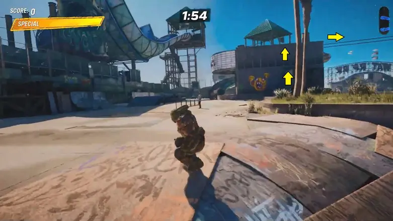 From the starting area, slide down to the bottom and look to your left. You’ll see a building with quarter pipes on its sides. Use one of the quarter pipes to launch yourself up onto the roof of that building. T