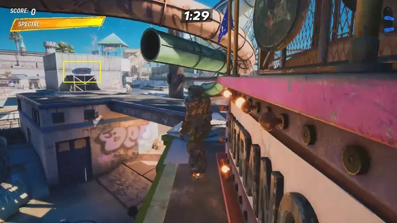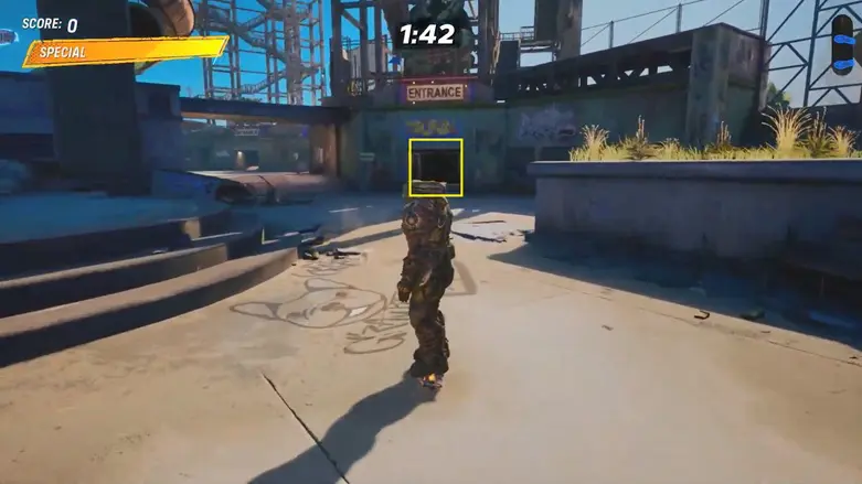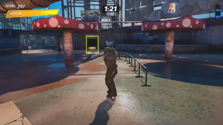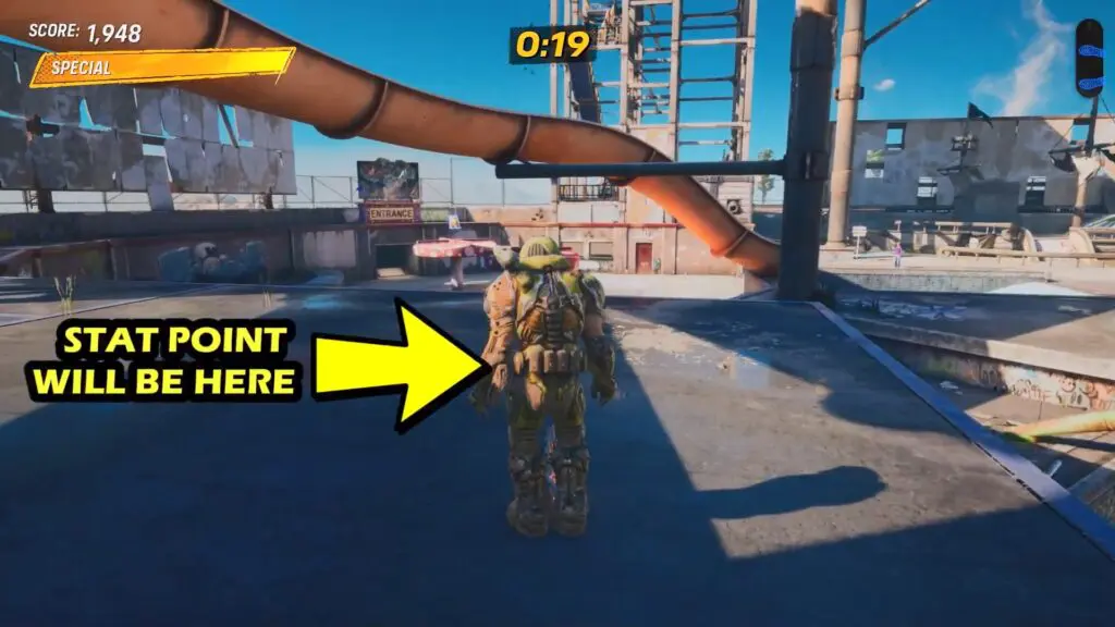 Instead of going down the slide, carefully drop off the right side. Then skate forward along the wall. Keep going until you reach a building with a stat point on top.