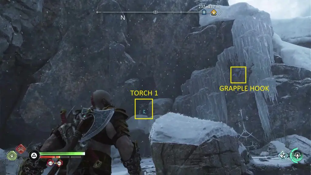 Torch #1 is on the right side of the chest as shown in the picture below. Ignite it with your blade. Torch #3 is above Torch #1 and Torch #2 is on top of the mountain wall on the left side of the chest. To reach those torches, grapple on the mountain wall on the right side of Torch #1. Then lean right and grapple to the hook on the opposite mountain wall. From there, you will be able to see Torch #3 as shown in the second picture below. Jump to the platform above Torch #3 and then go left to find Torch #2 as shown in the third picture below. Use your blade to ignite Torch #2. Then jump down to the platform near Torch #3 and ignite it using your blade. This will unlock the chest. Open it to get an Idunn Apple.
