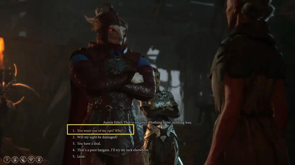 She wants one of your eyes, either your right or left. We don’t advise sacrificing your eye since Auntie Ethel will be unable to remove the parasite because it has been tampered with by odd shadow magic. You will permanently suffer from Perception Checks and have a disadvantage against Hag opponents