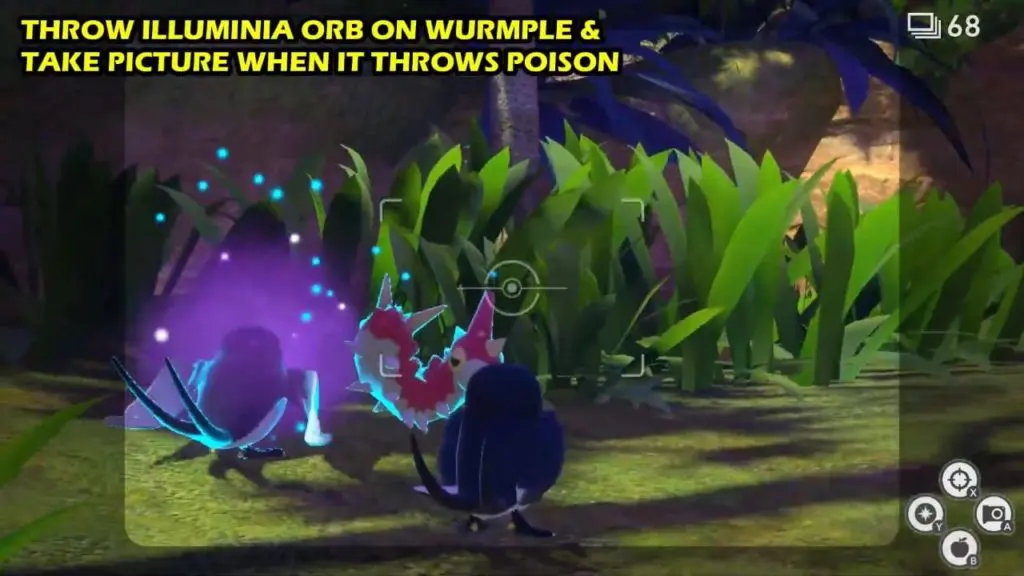 Professor Mirror will give you requests to do ‘What’s up with Wurmple’ request. The request is to Throw an Illumina Orb at the pair and take a picture of Wurmple’s poison attack.