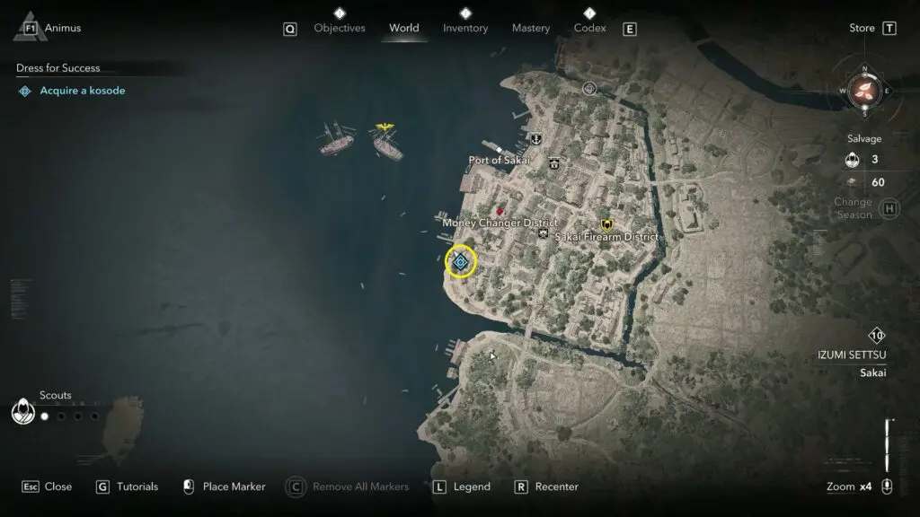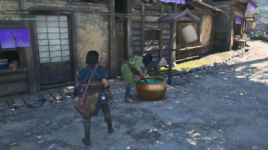 To acquire a Kosode, head to the Money Changer District area in Sakai, as shown in the below image. In Money Changer District, go near the edge by the docks. There you will find a lady merchant located by a house and washing clothes.