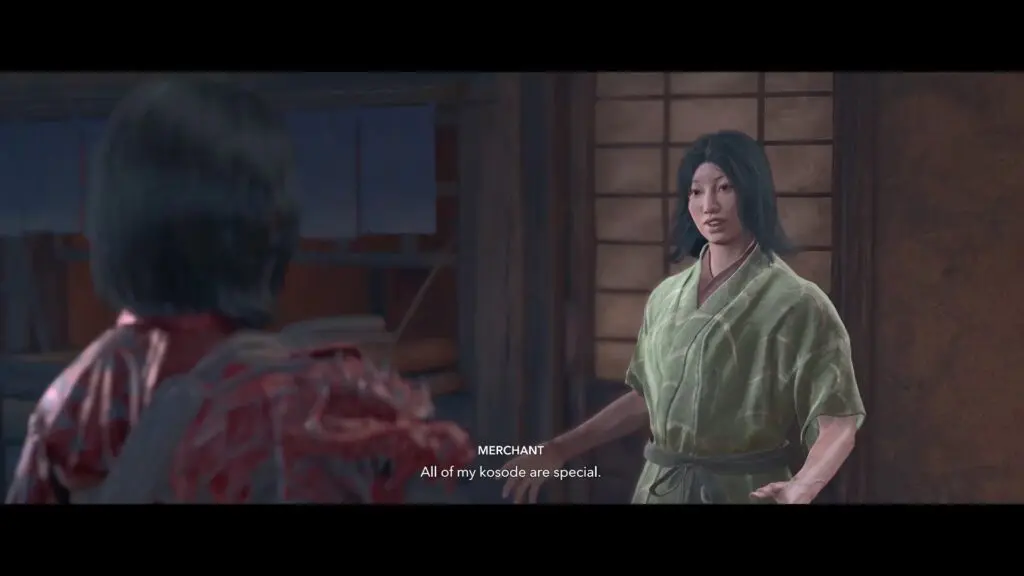 Speak to the lady merchant to acquire Kosode. She will explain that she needs a week to make the kosode because pirates have disrupted the silk shipment. All Kosode merchants are on the same ship. At this point, agree to take care of the pirates. She promises to make the Kosode in just one day once the silk is secured.