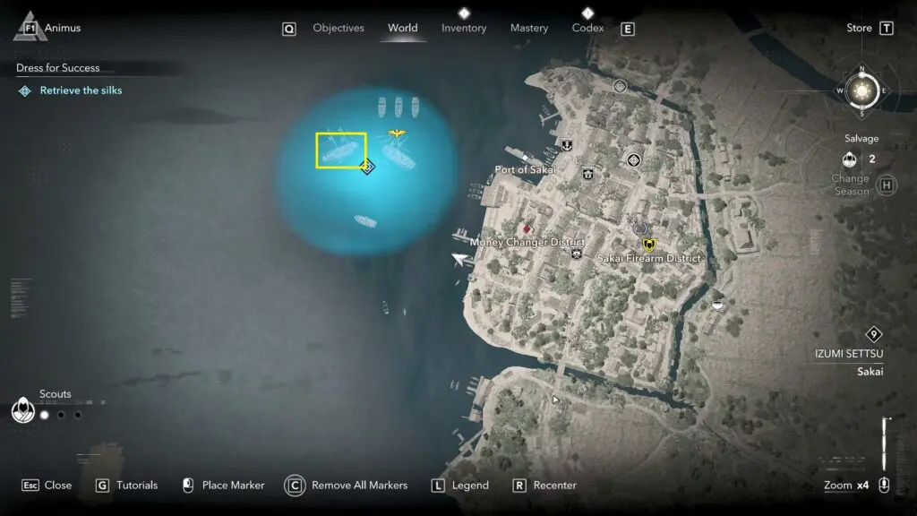 Next, head to the dock and find a small boat. Use it to sail across the water toward the large ship located in the western part of the dock.