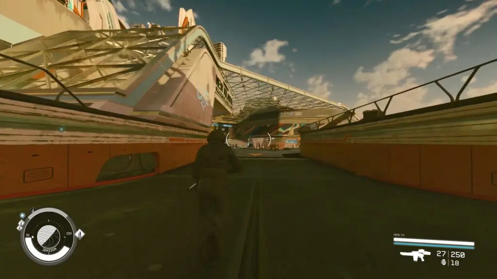 Upon arrival at the New Atlantis spaceport, proceed forward, descend the ramp, and pass through the glass-covered area.