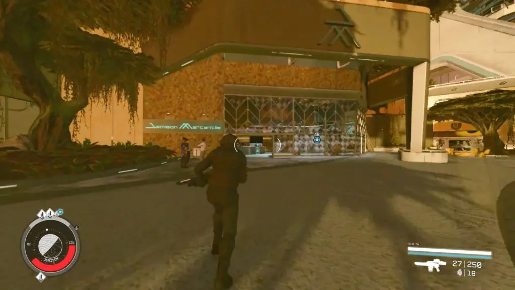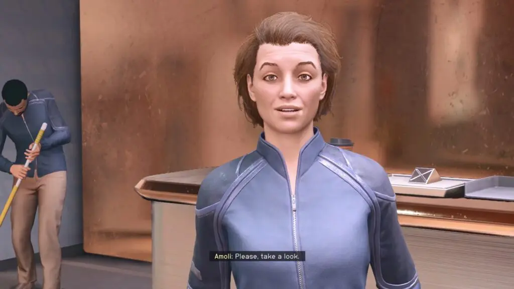 At the top, you’ll find two signs: The Viewpoint Bar on your left and the Jemison Mercantile general store straight ahead. Enter the Jemison Mercantile store and engage in conversation with Amoli Bava, who is typically stationed behind the counter.