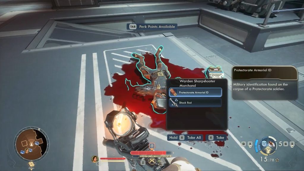 Here, you’ll find the body of Warden Gunner Aimes, who holds the third Protectorate Armorial ID.