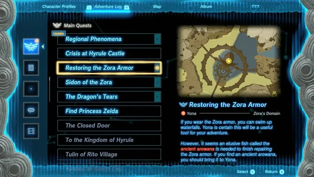 Now simply go back to Yona and give the Ancient Arowana fish to her. She will give you the Zora Armor, which will help you swim up the waterfalls. This will complete the quest.