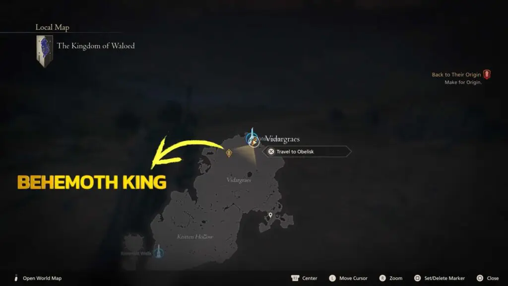 Behemoth King can be found in the northern area of the Vidargraes area in the empire of Waloed. To reach the location fast travel to Vidargraes Obliske and then head little bit southwest.