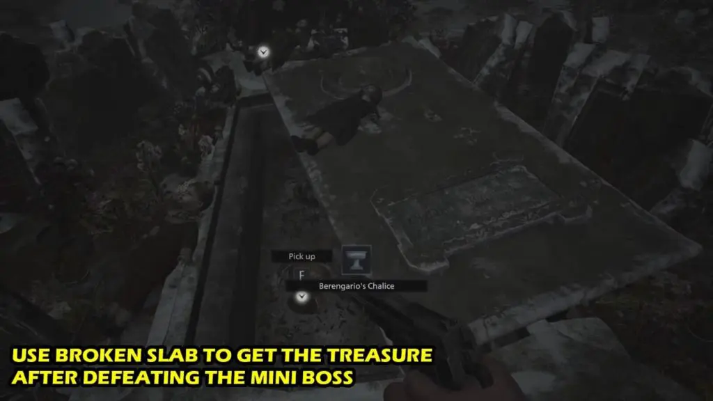 - Finally, place the Broken Slab on the grave to make the gravestone move. Collect the treasure – Berengario’s Chalice!