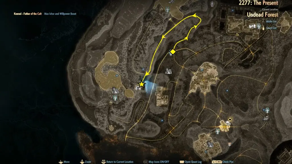 To find the Engraved Weapon in the Undead Forest, use the Abandoned Farm Mistle as your starting reference point. This makes the route easy to follow. From the Abandoned Farm Mistle, face east and take the road that goes uphill. Stay on this main path and continue moving forward. The road is fairly straight. Refer to the map.