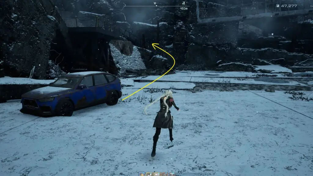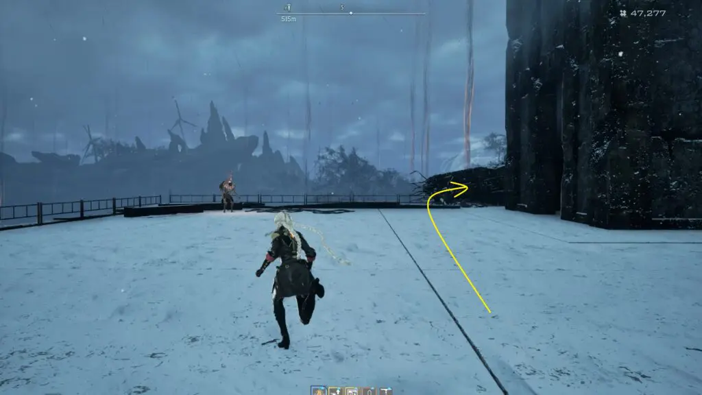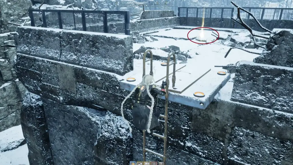 Once you reach the upper level, move to the left side of the building on the upper level. Here, you will find a ladder attached to the wall.