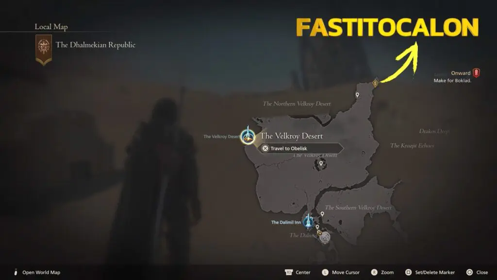 You can find Fastitocalon in The Velkroy Desert area of The Dhalmekia Republic. Fast Travel to The Velkroy Desert Obselik and then in the most northeastern part of The Velkroy Desert to the boss next to The Bandit’s Bed.