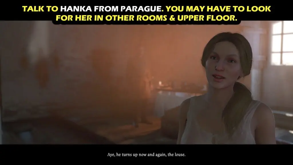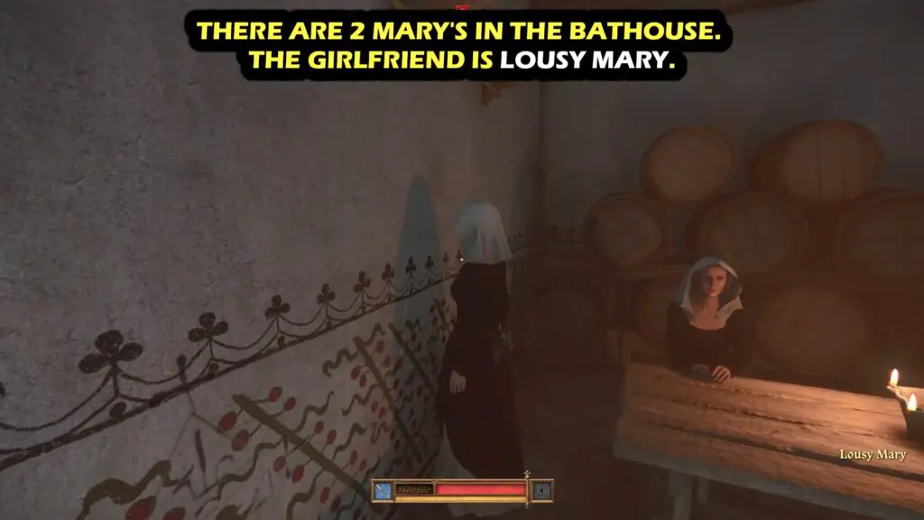 Head to the bathhouse located in the southeast corner of the search area. Once inside, speak with a maid named Hanka from Prague. She seems frustrated with Goatskin, as he has been robbing customers, causing trouble for the bathhouse. During your conversation, Hanka will mention that Mary is Goatskin’s girlfriend.