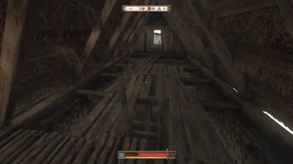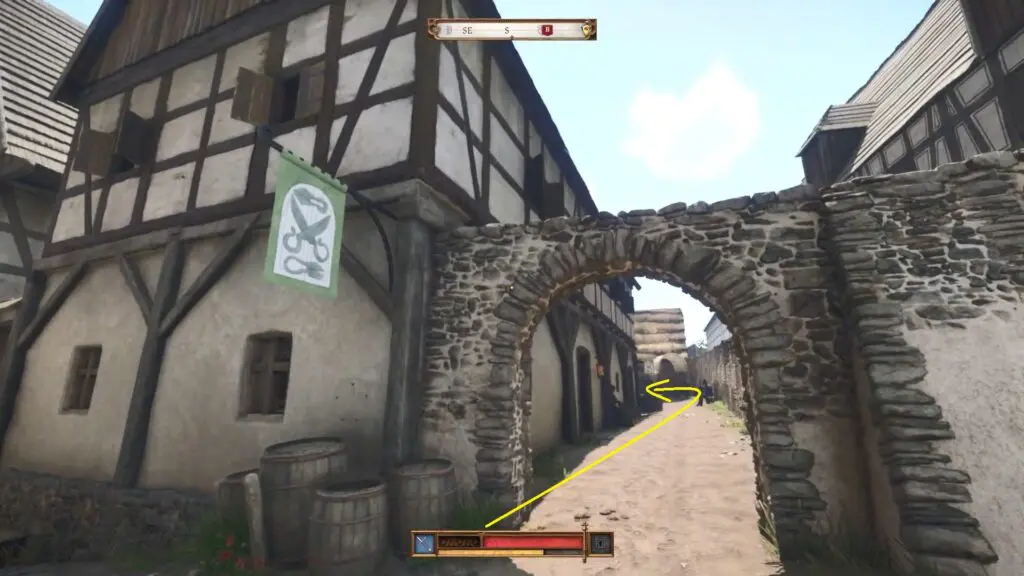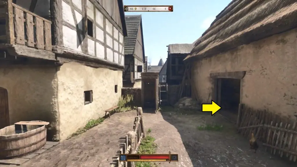Start your search by going to the barn behind the Tailor. Climb up the ladder inside the barn. Once you’re on the upper floor, walk across to the other side. At the end, drop down into a hidden courtyard that you can’t reach any other way.