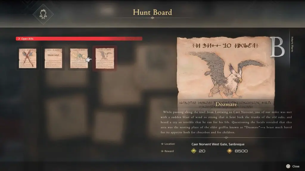 Choose the dialogue “Ask about griffin sightings” option to find out about the griffin Dozmare’s location. Its location is between Lostwing and Caer Norwent. The exact location is not mentioned in the note.