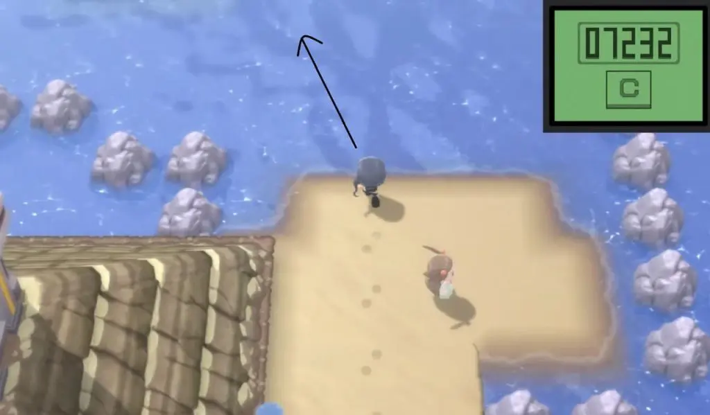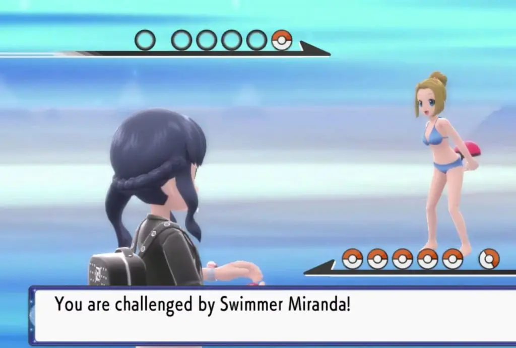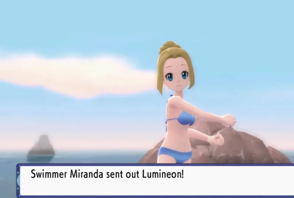 Go north on Route 223 in Sunyshore City till you reach the beach. Surf north to find Trainer Miranda just ahead. Challenge Miranda for a fight. Miranda will send a Lumineon to fight.
