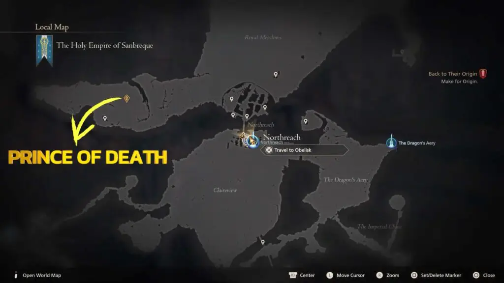 Prince of Death can be found in the empire of Sanbreque. To reach the location fast travel to Northreach Obliske and then head in the northwest direction to find the monster on a hill just east of Westwatch. Refer to the below image.