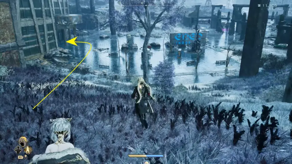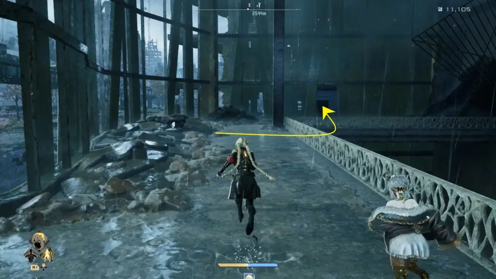 Go inside the building and wade through the water until you reach the stairs. Climb up to the upper floor, then turn around and follow the path forward. Keep going and pass through the narrow opening in the glass wall to reach the next part of the building.