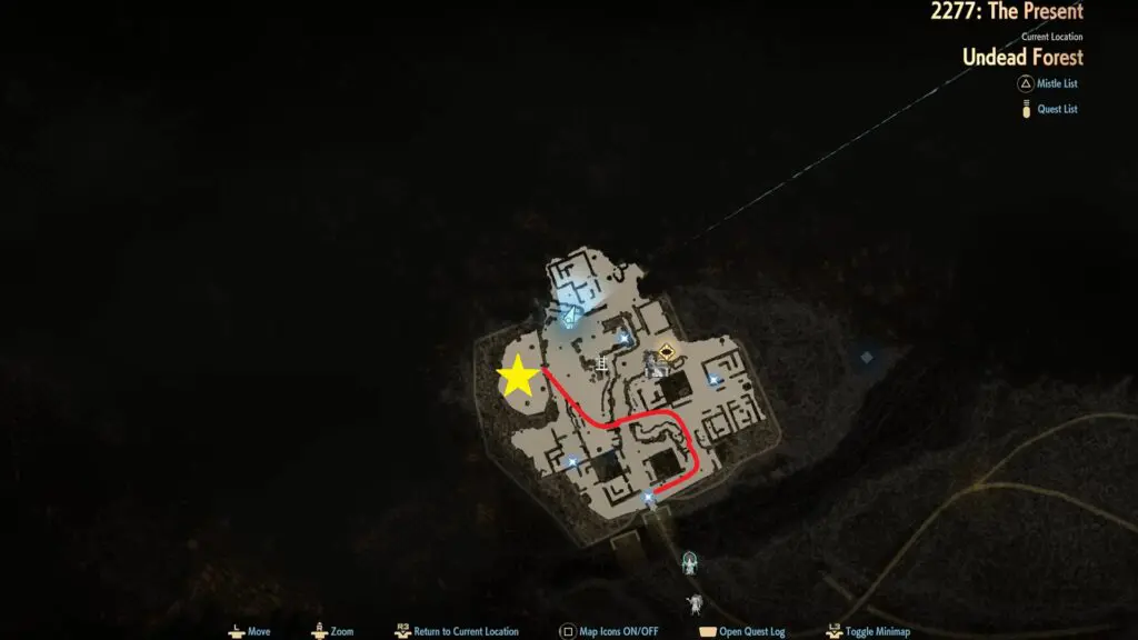 Once you reach the Undead Forest, continue through the tunnel until you exit and arrive at the first Mistle checkpoint. From the Mistle, turn right and enter a building with a broken wall.