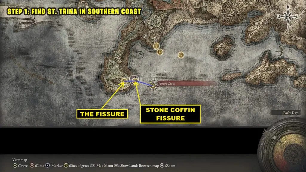 From The Fissure Site of Grace, go east, and soon you will reach the Stone Coffin Fissure Site of Grace. From there, take the path going down in the south direction. Follow the path and it will take you to the Fissue Cross Site of Grace as shown in the picture below.