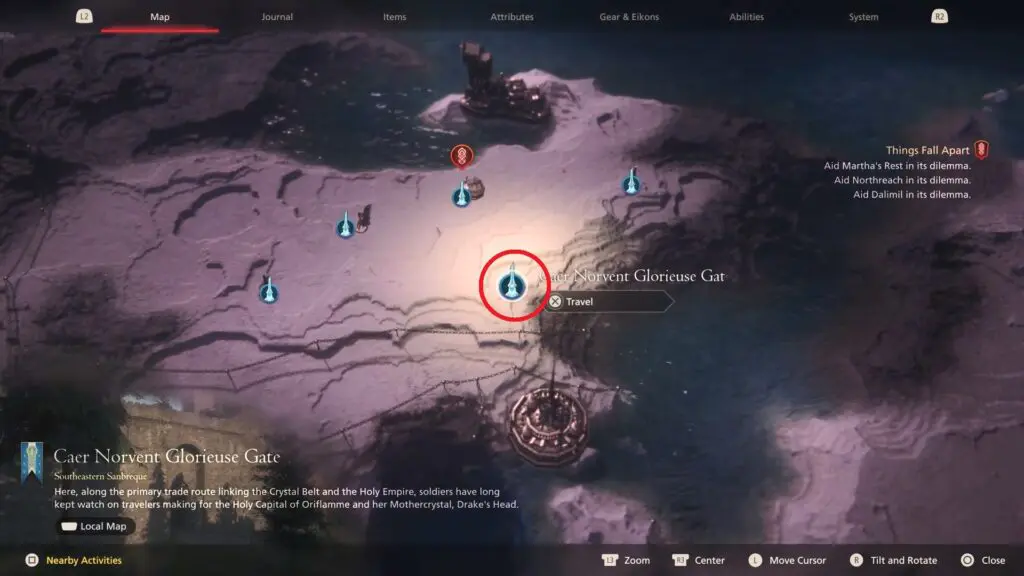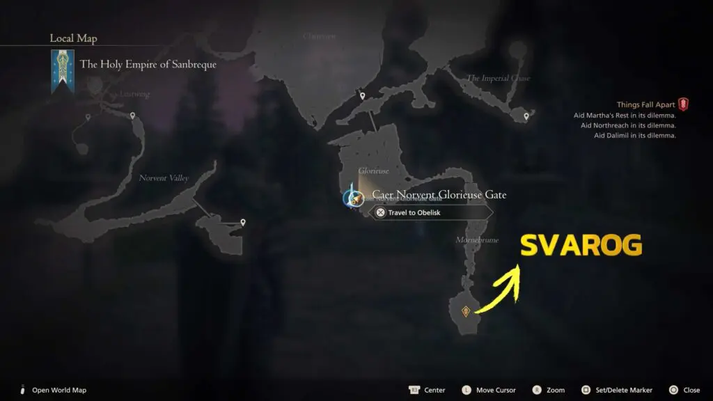 To find Svarog, fast travel to Caer Norvent Glorieuse Gate, which is on the eastern side of the map. This is the bottom-left corner of the “Glorieuse” map region.