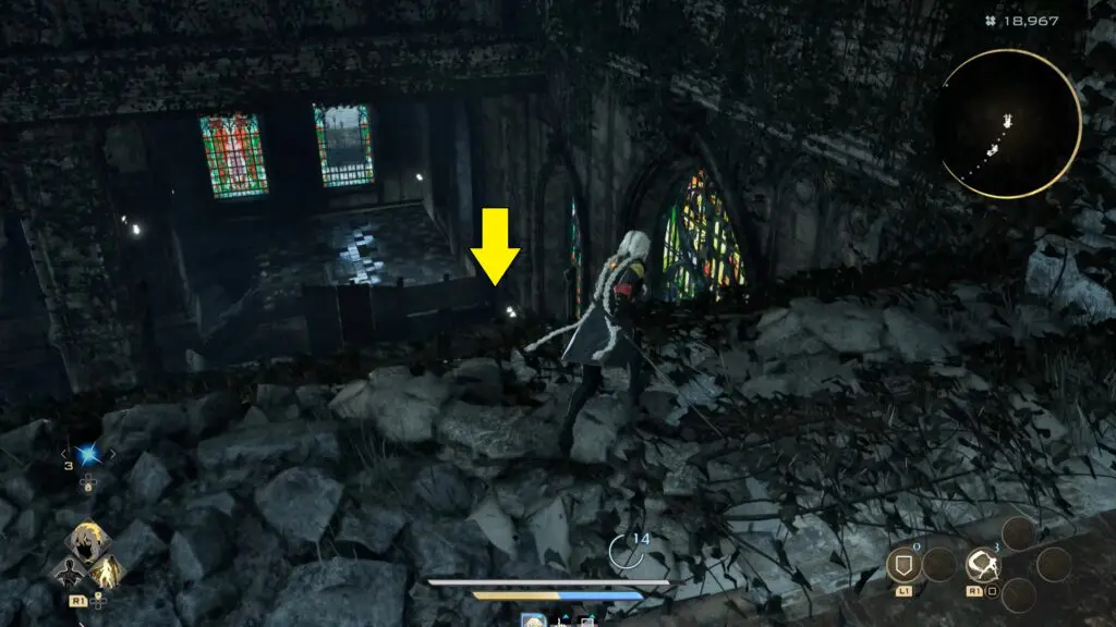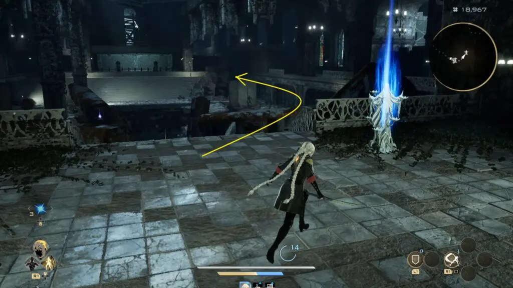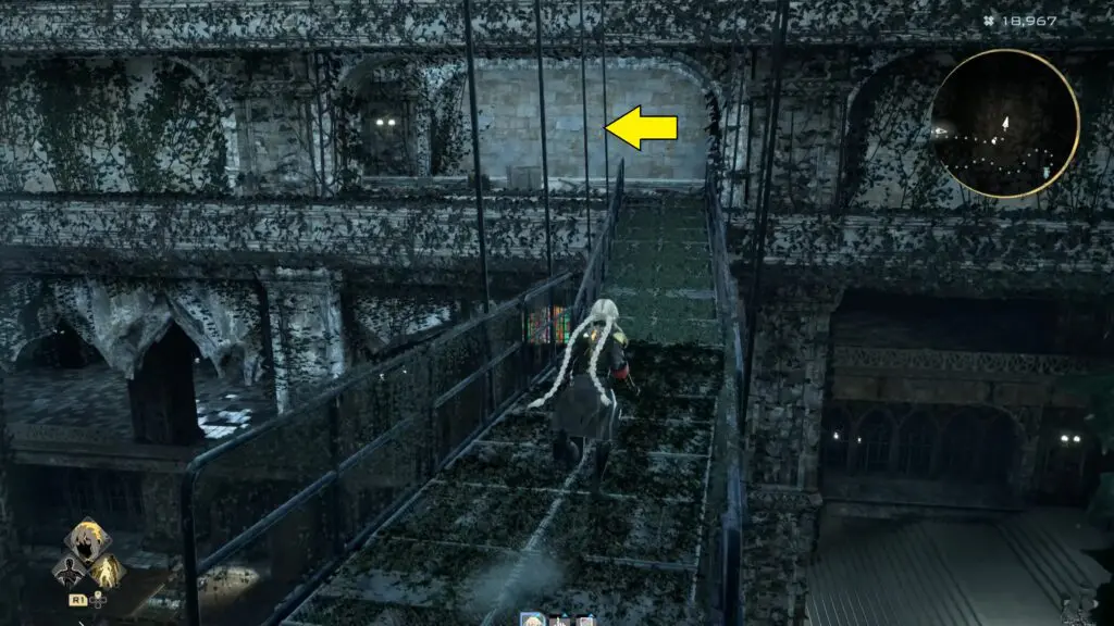 Cross the bridge and turn left. Keep progressing until the corridor comes to an end. Here, you will see a ladder. Climb down the ladder to reach a lower level and activate the nearby Mistle.