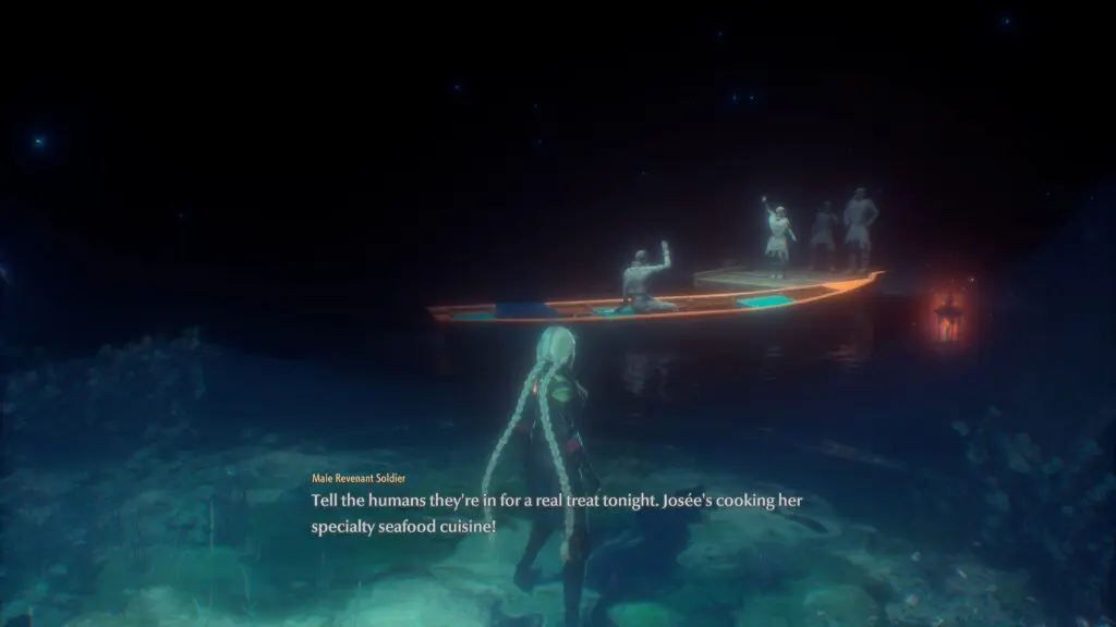 After the fight, move forward to enter a memory sequence where you see Josee in the past, fishing with other NPCs. Continue walking ahead through this memory until you reach a door.