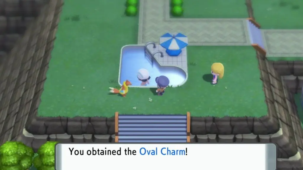 You’ll receive the Oval Charm as a gift from Morimoto after defeating him in battle. Before that, you’ll first need to defeat the Elite Four and become a Champion that is Hall of Fame. After becoming Champion head to the Hotel Grand Lake located on Route 213. Talk to Morimoto, you can find him swimming in the pool. Challenge him for a battle and beat him in a Battle and he will give you the Oval Charm.