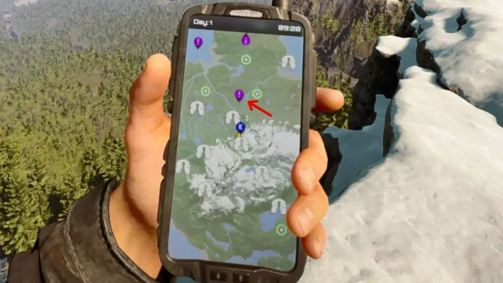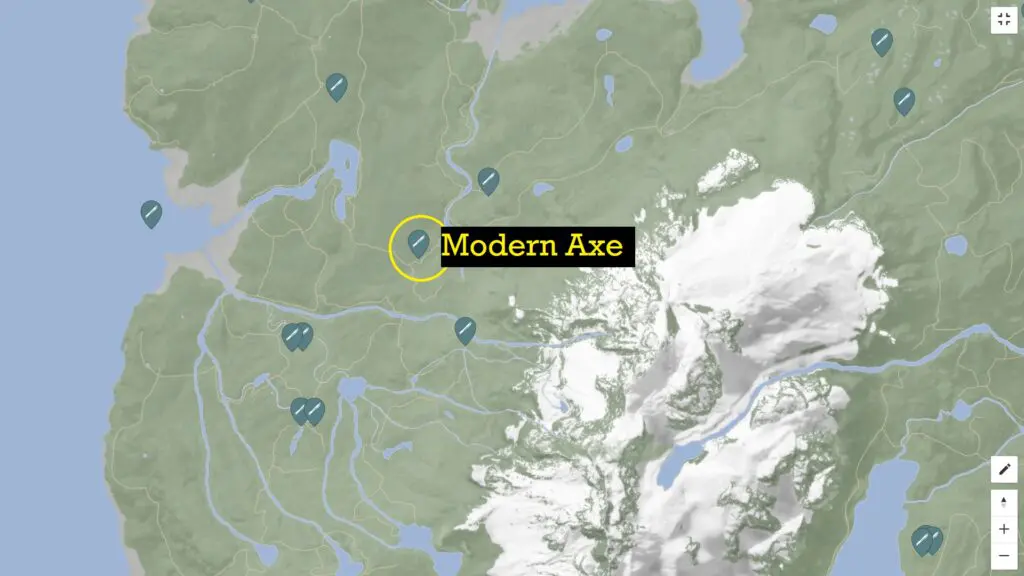 The modern axe can be found at a marked abandoned campsite location. This campsite is by the base of the snowy mountain. The exact position of this campsite can be seen in the image below. The modern axe’s location will be indicated on the map, with a purple exclamation point marker with a house icon also nearby.