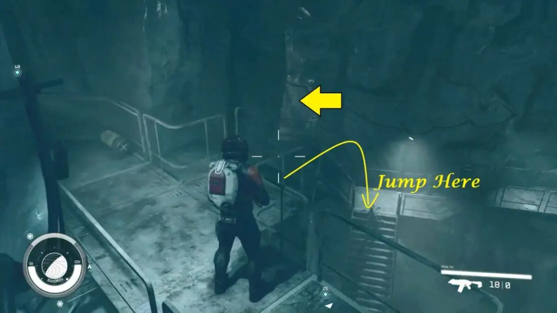 Go up the stairs on the left to reach the broken section of the catwalk. Use your jumpsuit to cross the broken section and proceed to the right.